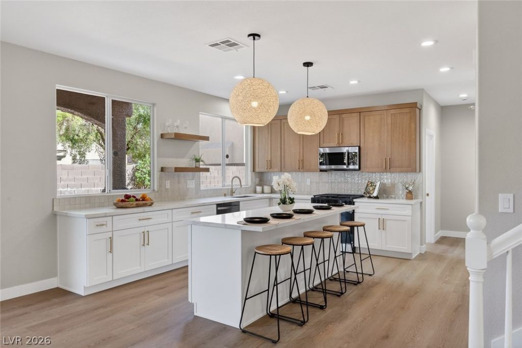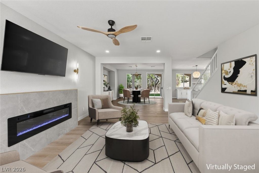 This beautifully upgraded two-story home in Henderson sits on a cul-de-sac, has PAID OFF SOLAR, & an incredibly low HOA payment! Inside, you'll find a bright, thoughtful layout with a cozy electric fireplace and a stunning modern kitchen showcasing quartz countertops, a large center island, designer pendant lighting, a stunning tile backsplash, and two-toned cabinetry?perfect for entertaining. Upstairs offers spacious bedrooms and an oversized loft that leads to a private balcony with amazing mountain & city views. The primary en-suite is a true retreat, where the spa-like bathroom offers stunning tile work in the shower, a separate tub, double-sinks, and a luxurious feel. Step outside to a private backyard retreat with a covered patio, perfect for indoor-outdoor living. Tucked within a well-kept community, this home offers a peaceful setting while still remaining conveniently close to everyday essentials. TOUR TODAY!