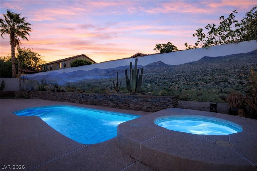 Beautifully maintained single-story home adjacent to Summerlin offering the perfect blend of comfort, functionality, & location. This property features 3 bedrooms plus a versatile den, ideal for a home office or additional living space. Enjoy a formal living room or comfortable family room, perfect for entertaining. The kitchen offers ample cabinet space & SS appliances, opening seamlessly to the main living areas. Luxury vinyl plank flooring & tall baseboards run throughout adding a modern touch. Enjoy luxurious upgrades in the primary bath with a walk-in shower & heated floors. Two guest bedrooms are separated by a convenient jack N jill bath. Step outside to a private backyard oasis complete w/ a heated pool, spa, rose-lined planters, & a unique removable outdoor mural. Additional highlights include a 3-car garage with built-in storage, rare side parking for toys or extra vehicles, & PAID solar for energy efficiency. Ideally located near shopping, dining, & outdoor amenities.