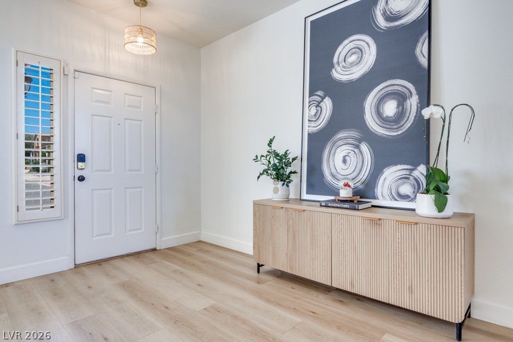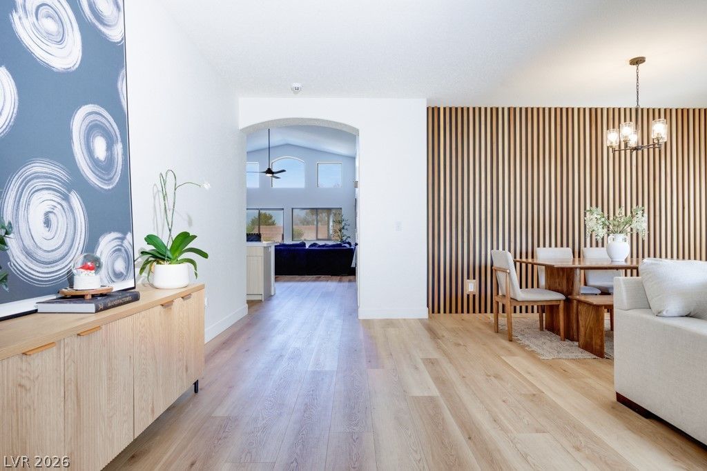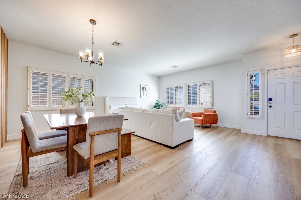 One of a kind Renovated 3BD-2BA w/ flex room, 2.5 car garage located near freeway & shopping. Gorgeous luxury vinyl plank flooring throughout except brms. The front Living Room/Dining Room showcases a designer Wood Slat wall focal point. Once you enter into the Kitchen/Great Room you will be elated by the back wall of windows filling your new home with an abundance of natural light, while you get to view the open blue sky. You'll love the thoughtfully Renovated Kitchen w/ luxurious quartz Countertops & Island with soft close 42 Shaker Cabinets, Farm sink, new LG SS appliances, & subway tile backsplash. The Great Room has a vaulted ceiling, cozy Fireplace w/tile surround and space for an oversized TV. Your Primary Suite is separated from the other 2 brms/Flex Space. An updated Primary Spa with Floating Vanity, Mirrors & Light Fixtures. Renovated Guest BA. Enjoy the Bkyd Spa or Elevated platform around the firepit. EV charger outlet installed. You need to see this one. Welcome Home!