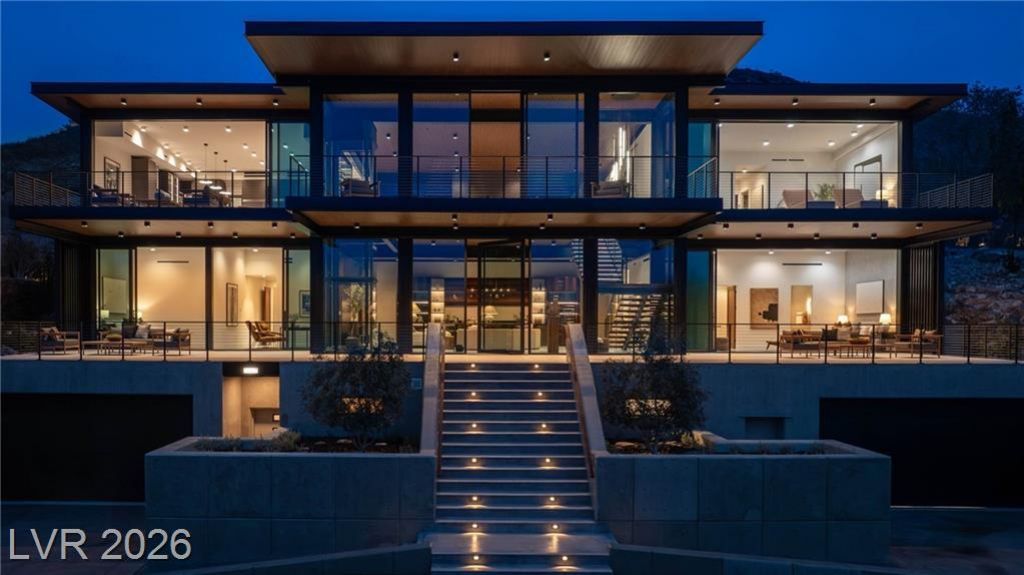 Featuring a one-of-one contemporary masterpiece after years in the making, this residence showcases exceptional construction with steel framing and poured-in-place concrete?materials rarely found in custom builds. The home is adorned with natural stone, DOCA cabinetry from Spain, home automation, and refined architectural details. An expansive floor plan captures Las Vegas Strip views through 12-foot glass, with every room designed for indoor-outdoor living. Energy efficiency is prioritized with a solar system placed to maximize sun exposure while remaining hidden. The main level features a striking kitchen with an integrated dining table, illuminated cabinetry, and wine display. A two-way fireplace opens to a resort-style backyard with lap pool, spa, fire pits, and more. A deep 6-car garage offers flex space for a gym, office, or additional rooms. Within walking distance of DragonRidge Country Club, this home represents the blend of vision, craftsmanship, and intelligent luxury.