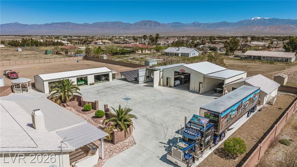 Custom 1.1-acre estate built for serious vehicle and equipment use, offering a rare blend of residential comfort and commercial-grade utility. Property features reinforced concrete designed for heavy vehicles, gated entry, and a fully block-walled rear yard-ideal for owner-operator semi-truck drivers, heavy- equipment owners, contractors, or RV enthusiasts. Vehicle amenities include an attached 12-car garage, detached garage/workshop, 50' x 16' RV garage, 15' x 40' workshop, circular driveway, and backyard access for secure, screened parking. The home itself offers soaring ceilings, formal dining, a spacious great room with stone fireplace,and a chef's kitchen with granite counters,stainless applia,double ovens, gas cooktop,oversized island,and pantry.Owner's suite includes patio access,walk-in closets,and spa-style bath.Covered patios,outdoor kitchen,gazebo,spa,mature landscaping,and owned solar complete this non-HOA property.Buyer to verify all features and intended use.