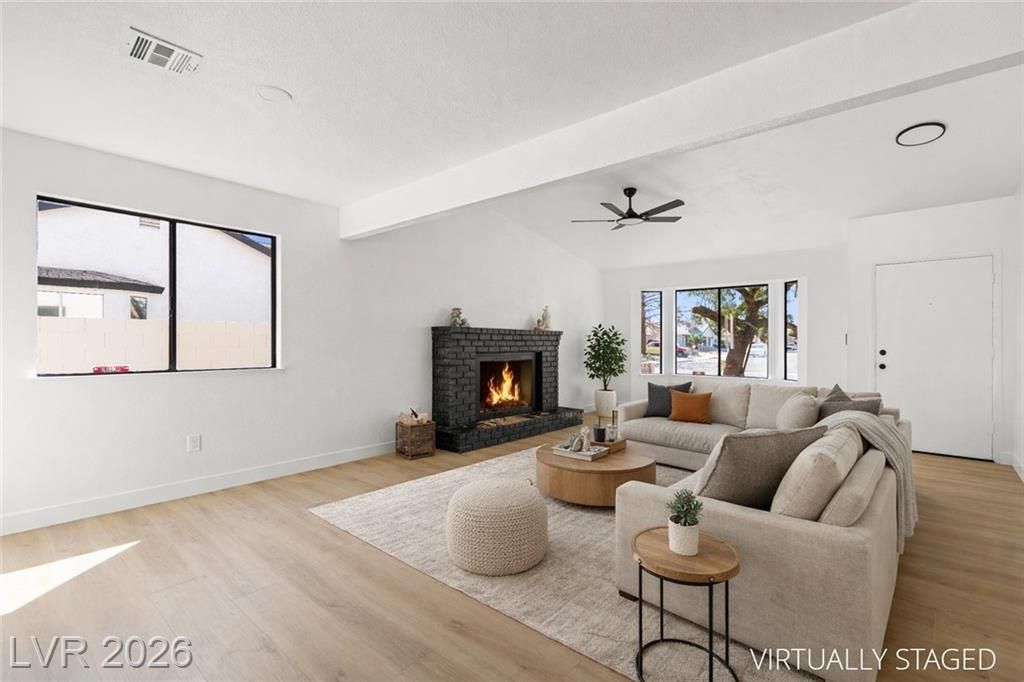 Beautiful single-story home featuring 3 bedrooms, 2 full bathrooms, and a 2-car garage. This home is truly move-in ready with 100% waterproof luxury vinyl plank (LVP) flooring throughout. Enjoy the open floor plan with a cozy fireplace and a stunning updated kitchen featuring light wood cabinetry, quartz countertops, stainless steel appliances, and a large center island with waterfall edge and seating, perfect for cooking and entertaining. The home offers spacious bedrooms and modern upgraded bathrooms with stylish finishes. Step outside to a spacious backyard with a pool and covered patio. This home also has potential RV parking with no HOA. Conveniently located near shopping, dining, and everyday essentials, making it a perfect place to call home. Come tour this lovely home today!