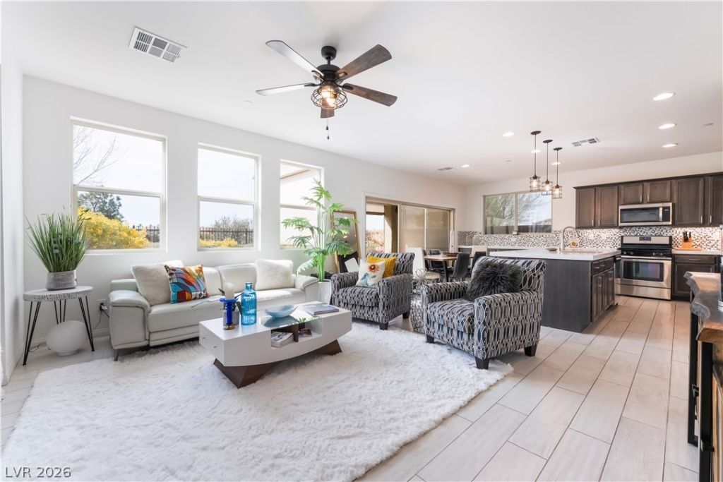Welcome home to luxury living with stunning Golf Course Frontage on the 18th Fairway. A long paver driveway and courtyard lead into a modern, open interior featuring wood-grain look White Plank Tile Flooring. The gourmet kitchen boasts quartz countertops, island w/pendant lighting, a walk-in pantry, and extended cabinetry for ample storage. The versatile downstairs includes a 4th bedroom with a built-in Murphy bed and an adjacent bath with a large shower. Upstairs, the Owner's Suite offers breathtaking views of the Chimera Golf Course, dual sinks, and a generous walk-in closet. Bedroom 2 features unobstructed views of the Las Vegas Strip. Enjoy a total of 4 bedrooms plus a loft, all with upgraded carpet and spacious closets. The exterior is designed for relaxation with a covered patio, motorized sun shades, and desert landscaping. The garage is finished with epoxy flooring and built-in cabinets. This home perfectly blends style and scenery! A Must See Truly Amazing Home.