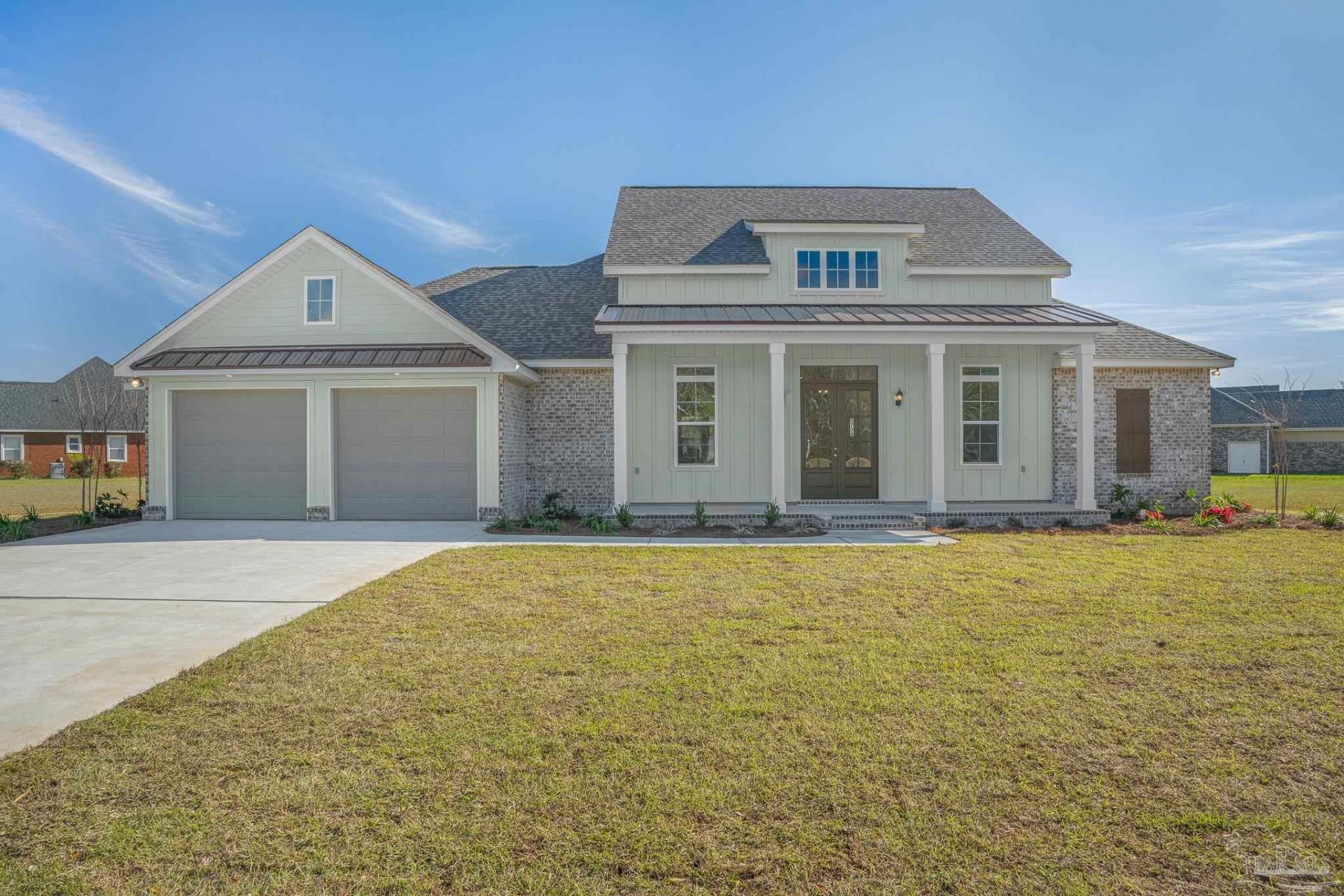 Behind the gates of The Moors, this custom Southern Farmhouse sits on a pond front lot and was thoughtfully built from the ground up with a one-of-a-kind floor plan you won't find anywhere else. Inside, 10-foot ceilings and a wide-open kitchen and living space create a natural gathering place at the heart of the home. Whether it's weeknight dinners around the island or a full house for the holidays, the layout delivers the space and flow everyone wants. Large rear windows frame the pond and pull the view straight into your everyday living area. The primary suite is positioned to capture those same pond views, with large windows overlooking the backyard. The ensuite bath feels like a private spa, complete with a large tiled walk-in shower, garden tub, and an impressive 15' x 8' walk-in closet that feels more like a dressing room than a closet. Step outside and you'll find one of the home's standout features: a covered back porch overlooking the pond, finished with a gas fireplace, TV hookups, and plumbing already in place for a future outdoor kitchen. It's built for football Saturdays, quiet mornings with coffee, or evenings around the fire. A spacious two-car garage leads into a functional mudroom with a custom-built drop zone for shoes, coats and bags, seamlessly connected to a decorative tiled laundry room, complete with a sink and custom cabinetry. With 4 bedrooms, 3 bathrooms, and 2,735 square feet of custom craftsmanship, this home offers space, privacy, and pond-front views inside a gated community, just 2 minutes to I-10, 10-15 minutes to shopping, and approximately 25 minutes to both Pensacola Beach and Historic Downtown Pensacola.
