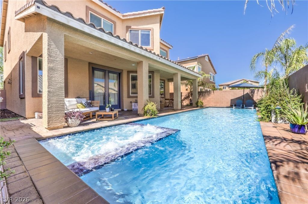 Stunning SW Beauty, 4 bedrooms, 3 bath, 3-car garage & Saltwater POOL & Spa*Lovely plank tile flooring throughout*Oversized kitchen w/Kitchen-Aide Stainless appliances Built-in Oven, 5 burner cook-top, Hood vent*Large prep Island, Granite counters & backsplash, oversized walk-in pantry*Soft close doors & cabinets*Dining area is adjacent to the kitchen*Great Room offers fireplace, pre-wired surround sound, French Doors out to the patio*Downstairs bedroom w/walk-in closet*Across the hall is the ¾ bathroom w/shower*Krystal Pure Water Softener*Beautiful open staircase leads up to the Loft area & 3 bedrooms*Smoked glass shower doors*Primary bedroom offers a sitting area, 2 walk-in closets*Upgraded electrical package*Saltwater pool has a splash area, integrated Spa & color changing lights*Covered patio*BBQ area*Single story home behind adds to privacy*Located in the amazing SW part of the Valley*Close to Summerlin, NEW Children's Hospital, NEW Durango Station Casino, The Bend & 215 Freeway*