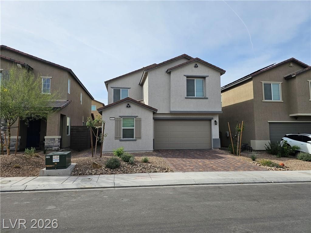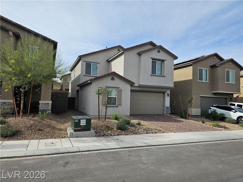 Beautiful and spacious 4-bedroom home with a rare downstairs bedroom and shower bath. The large great room opens to a modern kitchen featuring an oversized island, pantry, stainless steel appliances, and all-tile flooring downstairs. The upstairs primary suite offers a private balcony, huge 13Ã?7 walk-in closet, and separate tub and shower. Additional bedrooms include walk-in closets and a Jack-and-Jill bath. Home includes SOLAR, ceiling fans, extra storage, and a second-floor laundry room with washer and dryer. Desert landscaping in front and a 2-car attached garage. Located in a newer community with convenient access to Nellis, Lake Mead, and Hollywood.