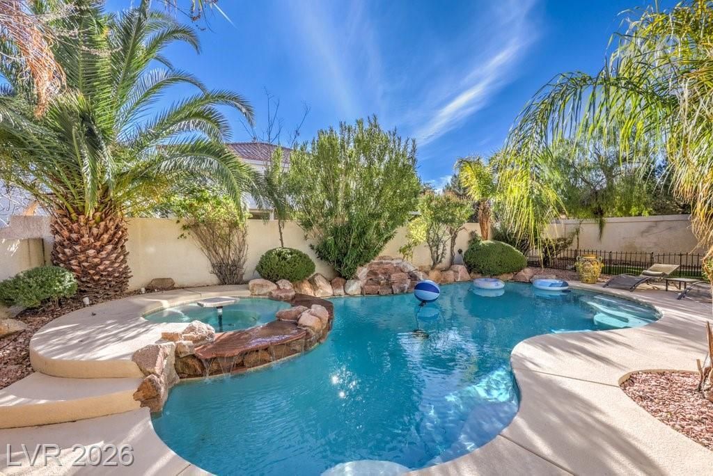 Experience refined living in this NEWLY PAINTED INTERIOR, expansive OVER 3,000 SQFT residence offering 5 bedrooms, 3 baths, 3-car garage, and an enviable CORNER LOT setting. The STUNNING 'CARIBBEAN ISLAND inspired backyard is a private resort, mature tropical landscaping, a sparkling pool with waterfall, built-in spa with table, covered patio, stamped concrete, BUILT-IN BBQ w/bar seating, and low-maintenance synthetic turf designed for elevated ENTERTAINING. Inside, the home flows beautifully with a formal living room featuring fireplace, an elegant dining space, and a chef's kitchen with PLENTY of cabinetry, island, and a casual dining area. The LARGE family room offers surround sound and seamless indoor-outdoor living. FULL BEDROOM & 3/4 BATH DOWNSTAIRS. Upstairs, retreat to the secluded PRIMARY SUITE, complemented by a LARGE LOFT w/surround sound, a FULL bathroom, and three additional bedrooms. Ideally located near shopping, dining, & I-215.